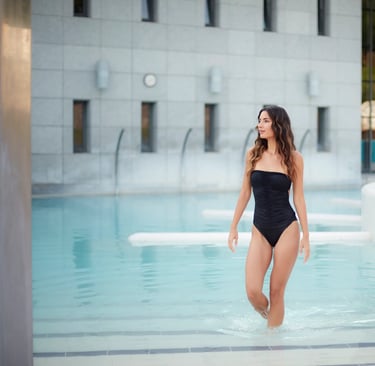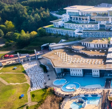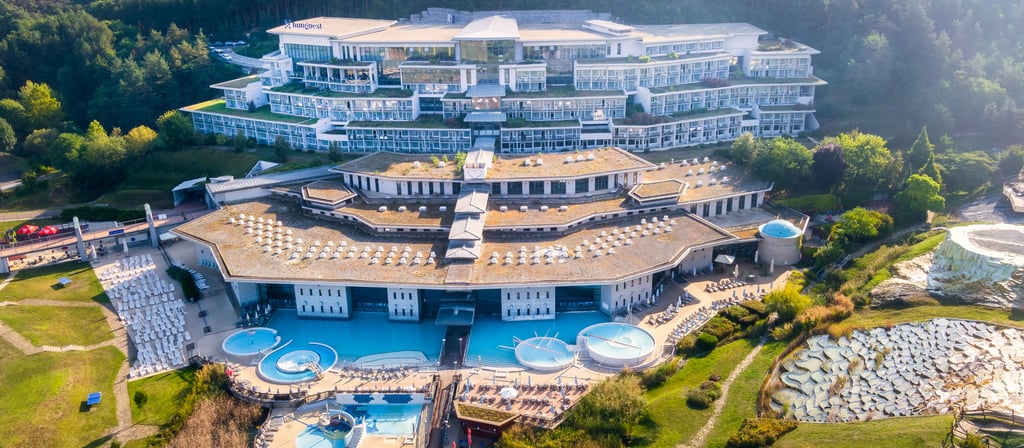 The thermal springs at Egerszalók carry hugely restorative properties, classified since 1992 as official medicinal water, rich in calcium, magnesium, hydrogen carbonate, sodium, and metasilicic acid. These elements impart anti-inflammatory effects beneficial for degenerative joint disorders, spinal issues, skin conditions like eczema, and post-operative rehabilitation. The Saliris Resort Spa, built at the base of Salt Hill in 2007, offers access to 17 indoor and outdoor pools totaling approximately 1,900 m² of water surface. Facilities include both thermal bathing, floating pools, Kneipp pools, jacuzzi spas, cave pools, and physiotherapeutic pools between 33 °C and 42 °C. Visitors may float in sitting pools filled with bubbling spring water or relax in echo pools and cold plunge basins. The water's warmth and mineral content combine with peaceful forested surroundings to create a restorative environment, where wellness ritual, therapeutic immersion, natural mineral synergy, ambient tranquility, and architectural harmony elevate bathing into a holistic health experience.